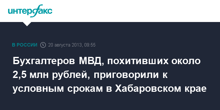 Хабаровск. 20 августа. INTERFAX.RU - Суд в Хабаровском крае признал трех женщин, работавших бухгалтерами в ОМВД по району им. Лазо, виновными в мошенничестве. Подсудимые получили полтора, три и пять лет лишения свободы, все сроки условные, сообщает СУ СКР по региону во вторник.
