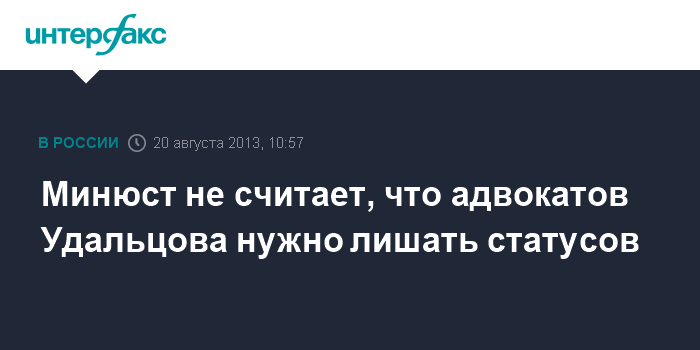 Москва. 20 августа. INTERFAX.RU - Минюст не нашел оснований для лишения статуса адвокатов оппозиционера Сергея Удальцова, которых СКР просил привлечь к ответственности за якобы отражение в СМИ точки зрения их подзащитного, находящегося под домашним арестом.