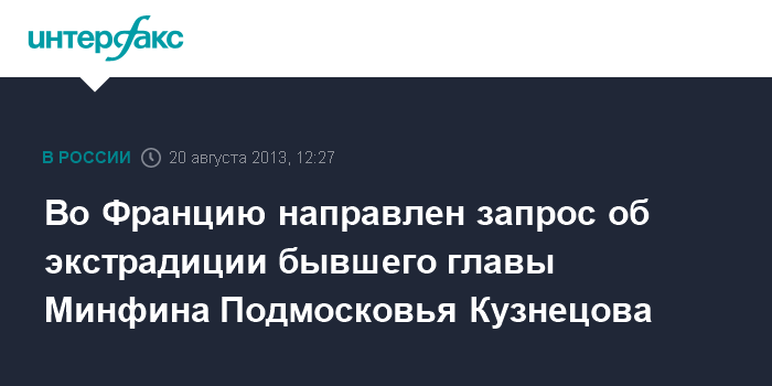 Москва.20 августа. INTERFAX.RU - Генеральная прокуратура России направила во Францию официальный запрос на выдачу бывшего министра финансов Московской области Алексея Кузнецова.