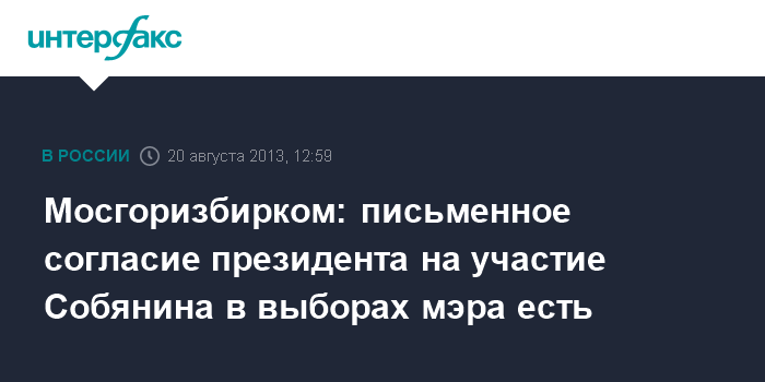 Москва. 20 августа. INTERFAX.RU - Кандидат в мэры Москвы Сергей Собянин представил в Мосгоризбирком в установленном порядке со всеми другими необходимыми документами письменное согласие президента РФ на его участие в выборной кампании.