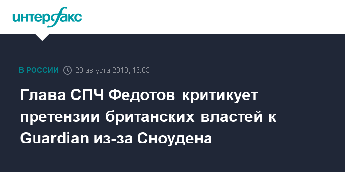 Москва. 20 августа. INTERFAX.RU - Глава российского президентского Совета по правам человека Михаил Федотов считает неправильным давление британских властей на газету The Guardian из-за материалов, переданных экс-сотрудником американских спецслужб Эдвардом Сноуденом.