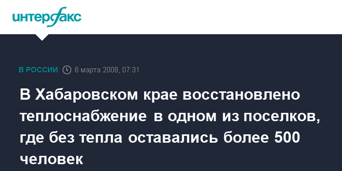 Хабаровск. 6 марта. ИНТЕРФАКС-ДАЛЬНИЙ ВОСТОК - В Хабаровском крае в поселке Амгунь, где более 500 жителей остались без тепла в результате дорожной аварии, восстановлено теплоснабжение.