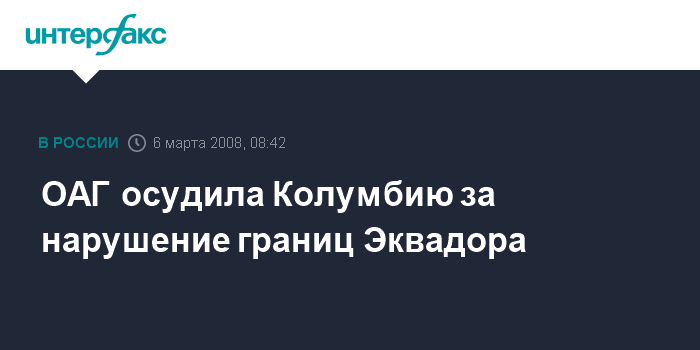 Вашингтон. 6 марта. INTERFAX.RU - Организации американских государств (ОАГ) на экстренной сессии приняла резолюцию с осуждением нападения колумбийских военных на лагерь повстанцев на территории Эквадора, сообщает в четверг телекомпания Си-Эн-Эн.