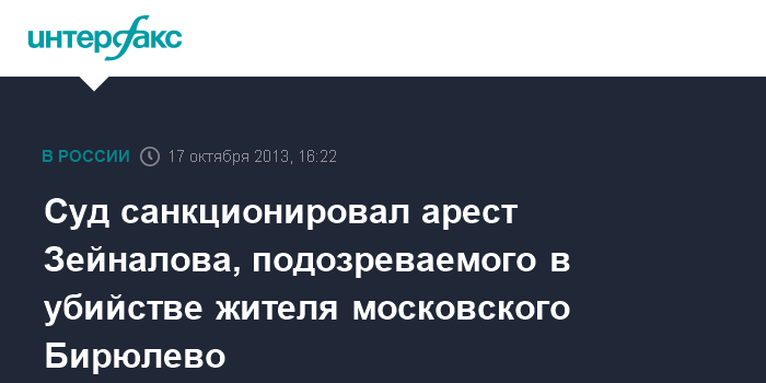 Москва. 17 октября. INTERFAX.RU - Гражданин Азербайджана Орхан Зейналов, подозреваемый в убийстве жителя московского района Бирюлево-Западное Егора Щербакова, заключен под стражу, передал корреспондент "Интерфакса" в четверг.