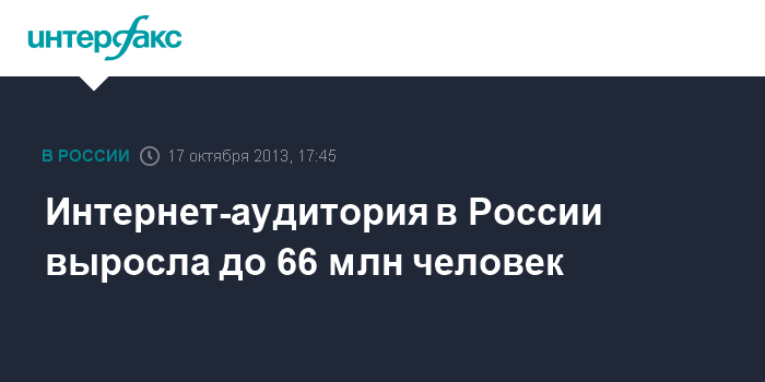 Москва. 17 октября. INTERFAX.RU - Осенью этого года ежемесячная интернет-аудитория в России составила 66,1 млн человек в возрасте старше 18 лет, или 57% населения страны, заявила руководитель проекта "ФОМ-Рунет" фонда "Общественное мнение" (ФОМ) Светлана Борисова на конференции RIW 2013 (Russian Internet Week).