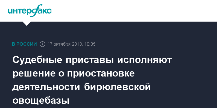 Москва. 17 октября. INTERFAX.RU - Руководство Федеральной службы судебных приставов взяло на контроль исполнение решения Чертановского суда Москвы о приостановке на три месяца деятельности овощебазы в Бирюлево.
