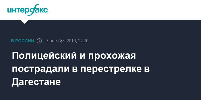 Махачкала. 17 октября. INTERFAX.RU - Сотрудник полиции и случайная прохожая ранены в результате вооруженного инцидента в Хасавюрте, преступник был убит в перестрелке, сообщили "Интерфаксу" в четверг в пресс-службе МВД по Дагестану. Перестрелка произошла при попытке полицейского патруля проверить документы у водителя остановленного автомобиля.