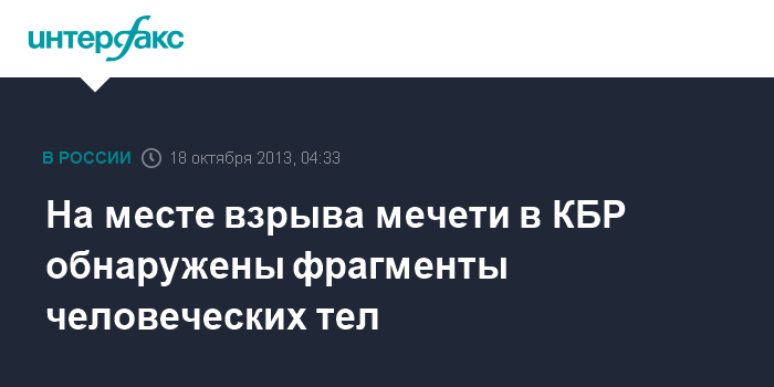 Ростов-на-Дону. 18 октября. ИНТЕРФАКС - Фрагменты человеческих тел обнаружены на месте взрыва близ здания мечети в селе Дугулубгей Баксанского района КБР, сообщили агентству "Интерфакс-Юг" в правоохранительных органах республики.