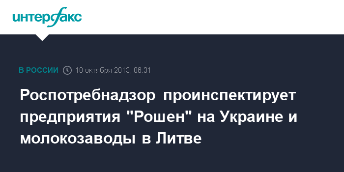 Москва. 18 октября. ИНТЕРФАКС - Сразу две инспекции готовится направить на следующей неделе за рубеж Роспотребнадзор - на Украину на предприятия корпорации "Рошен" и в Литву на молокоперерабатывающие заводы.