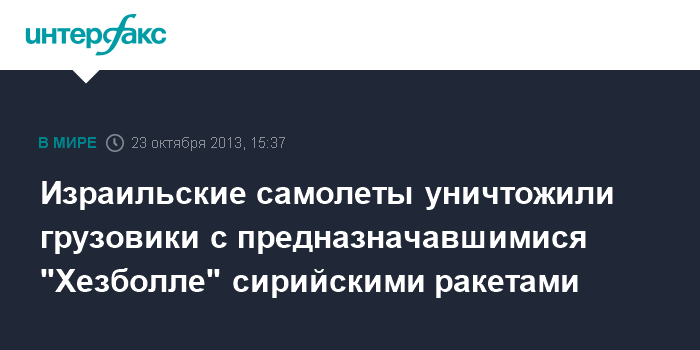 Каир. 23 октября. INTERFAX.RU - Военные самолеты Израиля, по некоторым данным, атаковали на границе между Ливаном и Сирией колонну грузовиков с сирийскими ракетами, которые предназначались боевикам ливанского движения "Хезболла", сообщает в среду кувейтская газета "Аль-Джарида".