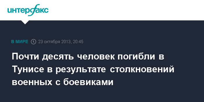 Дубай. 23 октября. INTERFAX.RU - По меньшей мере, семь военнослужащих национальной гвардии Туниса и два боевика погибли в результате столкновений в городе Сиди-Бузид на юге страны, передает в среду межарабский телеканал Al Arabiya.