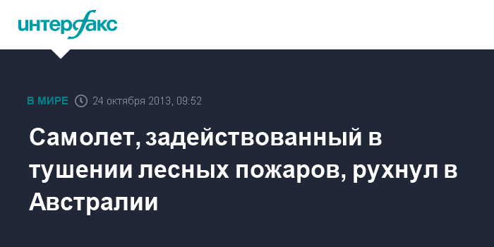 Лондон. 24 октября. INTERFAX.RU - Пожарный самолет, задействованный в тушении лесных пожаров в австралийском штате Новый Южный Уэльс, рухнул в четверг в 200 километрах от Сиднея, сообщает телерадиокорпорация BBC.