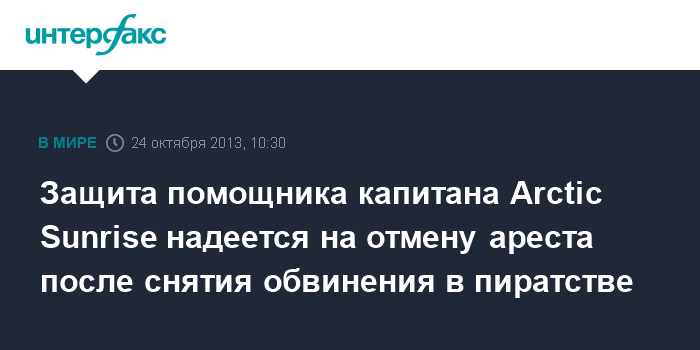 Защита помощника капитана Arctic Sunrise надеется на отмену ареста после снятия обвинения в пиратстве