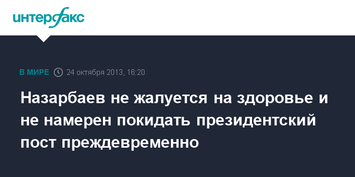 Астана. 24 октября. INTERFAX.RU - Президент Казахстана Нурсултан Назарбаев на встрече с жителями Уральска (адмцентр Западно-Казахстанской области) заявил, что чувствует себя нормально и не намерен уходить в отставку.