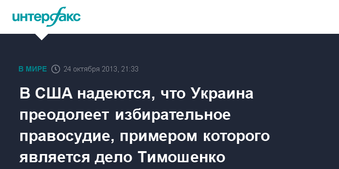 Киев. 24 октября. INTERFAX.RU - Заместитель руководителя Бюро по вопросам демократии, прав человека и труда Государственного департамента США Томас Мелиа надеется, что избирательно правосудие останется в Украине в прошлом.