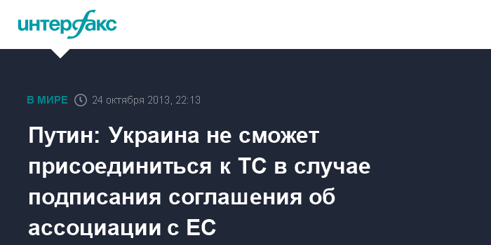 Минск. 24 октября. INTERFAX.RU - Присоединение Украины к Таможенному союзу в случае подписания ею соглашения об ассоциации с ЕС невозможно, но Россия не будет вмешиваться в решение Киева, заявил президент РФ Владимир Путин.