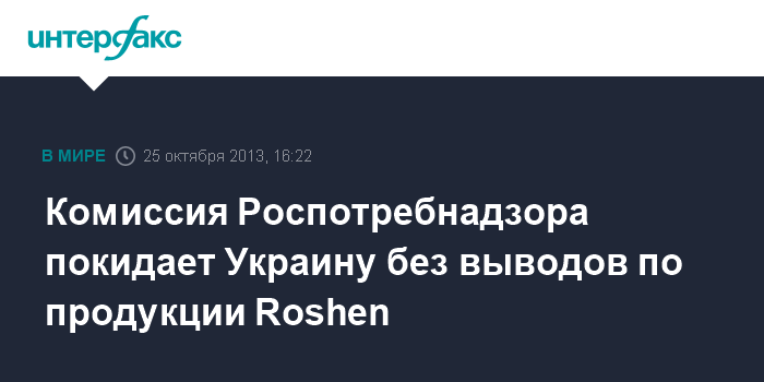 Киев. 25 октября. INTERFAX.RU - Министерство аграрной политики и продовольствия Украины заявило о завершении рабочей поездки в страну комиссии Роспотребнадзора по проверке кондитерских фабрик корпорации Roshen без выводов по итогам таких проверок, сообщил журналистам первый заместитель министра Иван Бисюк в пятницу.