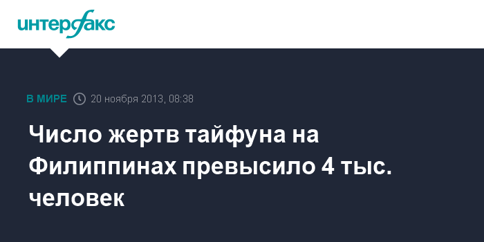 Манила. 20 ноября. INTERFAX.RU - Официальное число погибших в результате тайфуна "Хайян" на Филиппинах превысило 4 тыс. человек, сообщили в среду филиппинские власти.