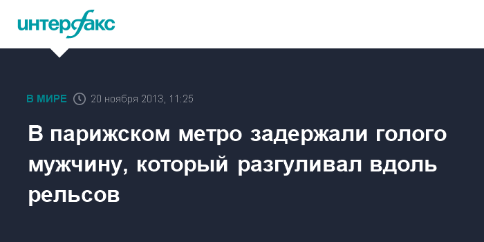 Париж. 20 ноября. INTERFAX.RU - Сотрудники службы безопасности парижского метро задержали мужчину, который голышом прогуливался вдоль рельсов, сообщает в среду веб-сайт газеты Le Figaro.