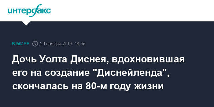 Дочь Уолта Диснея, вдохновившая его на создание "Диснейленда", скончалась на 80-м году жизни