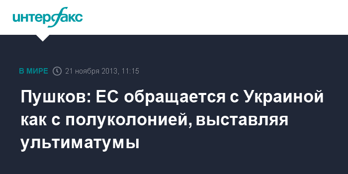 Москва. 21 ноября. INTERFAX.RU - Глава комитета Госдумы по международным делам Алексей Пушков считает, что ЕС оказывает "чудовищное давление" на Украину, выставляя ультиматумы.