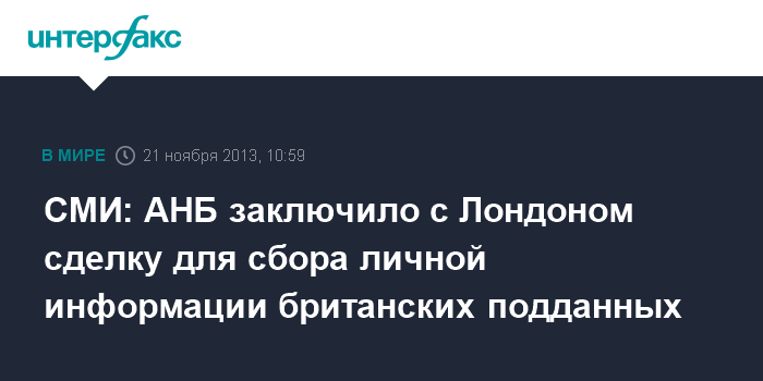 Лондон. 21 ноября. INTERFAX.RU - Британские власти в 2007 г. дали согласие на то, чтобы Агентство национальной безопасности США (АНБ) сохраняло и анализировало телефонные переговоры и переписку по электронной почте подданных Великобритании, свидетельствуют секретные данные, переданные Эдвардом Сноуденом британским СМИ.
