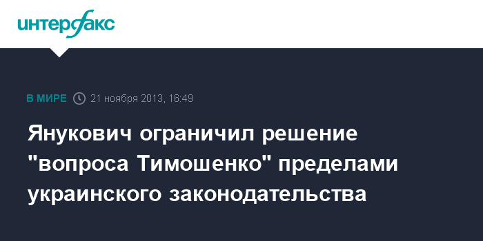 Вена. 21 ноября. INTERFAX.RU - Решение вопроса экс-премьера Украины Юлии Тимошенко возможно только в плоскости действующего на Украине законодательства, заявляет президент Украины Виктор Янукович.