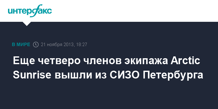 Санкт-Петербург. 21 ноября. INTERFAX.RU - Четверо членов экипажа Arctic Sunrise, задержанные за акцию Greenpeace в Печорском море, вышли из следственных изоляторов Петербурга, сообщается в Twitter организации в четверг.