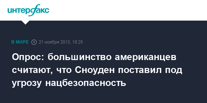 Вашингтон. 21 ноября. INTERFAX.RU - Все больше граждан США полагают, что разоблачительная деятельность бывшего сотрудника ЦРУ и АНБ Эдварда Сноудена нанесла вред программам национальной безопасности страны, свидетельствуют результаты соцопроса, проведенного по заказу американской газеты Washington Post и телеканала ABC.