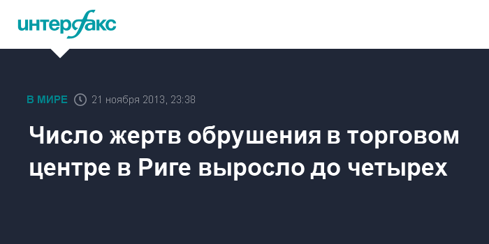 Рига. 21 ноября. INTERFAX.RU - Согласно обновленным данным Государственной пожарно-спасательной службы (ГПСС) Латвии, число погибших при обрушении в торговом центре в Риге выросло до четырех человек, среди погибших один спасатель.