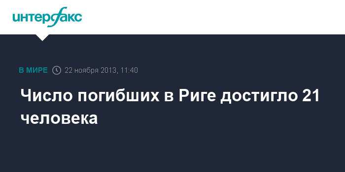 Рига. 22 ноября. INTERFAX.RU - В результате обрушения здания торгового центра в Риге погибли 21 человек, цитирует латвийские СМИ в эфире радио Baltkom представитель "скорой помощи" Илзе Букша, передает портал Mixnews.lv.