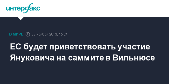 Брюссель. 22 ноября. INTERFAX.RU - Европейский союз будет приветствовать участие президента Украины Виктора Януковича в предстоящем саммите Восточного партнерства в Вильнюсе 28 - 29 ноября, заявляет пресс-секретарь Верховного представителя ЕС по вопросам внешней политики и политики безопасности, вице-президента Европейской комиссии Кэтрин Эштон Майя Косьянчич.