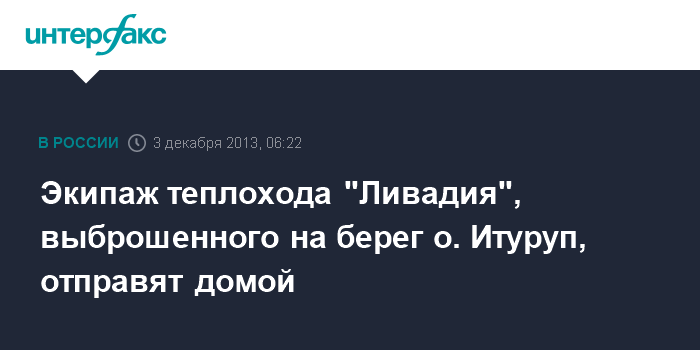 Южно-Сахалинск. 3 декабря. ИНТЕРФАКС - ДАЛЬНИЙ ВОСТОК - Экипаж, находящийся на выброшенном в октябре на камни острова Итуруп (Средние Курилы. - ИФ) сухогрузе "Ливадия", в ближайшие дни планируют снять и отправить домой, сообщили агентству "Интерфакс - Дальний Восток" в морском спасательном подцентре (МСПЦ) "Южно-Сахалинск".