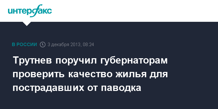 "Есть информация, что быстровозводимое жилье не соответствует санитарным нормам. Я прошу вас вместе с министерством регионального развития проверить качество строительства нового жилья. Люди должны жить в нормальных условиях", - сказал Ю.Трутнев, открывая заседание правительственной комиссии по ликвидации последствий крупномасштабного наводнения на Дальнем Востоке.