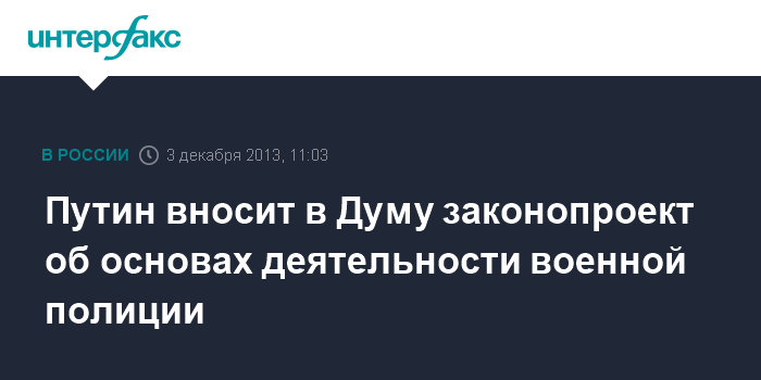 Москва. 3 декабря. INTERFAX.RU - Президент России Владимир Путин внес в Госдуму федеральный законопроект, направленный на установление законодательных основ деятельности военной полиции Вооруженных сил РФ.