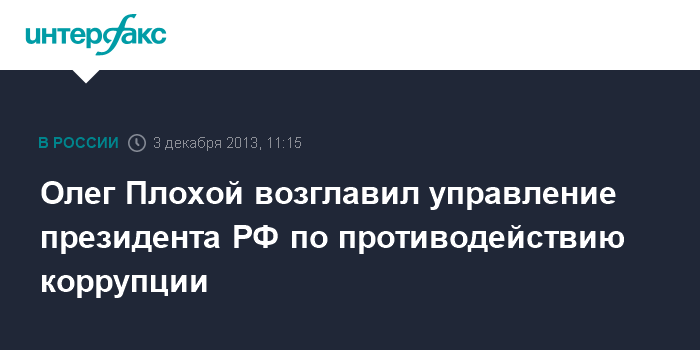 Москва. 3 декабря. INTERFAX.RU - Владимир Путин своим указом назначил Олега Плохого начальником Управления президента РФ по вопросам противодействия коррупции, сообщили во вторник "Интерфаксу" в пресс-службе Кремля.