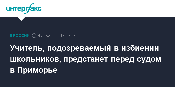 Владивосток. 4 декабря. ИНТЕРФАКС - ДАЛЬНИЙ ВОСТОК - Суд рассмотрит дело учителя школы села Покровка Октябрьского района Приморья, обвиняемого в избиении учеников.