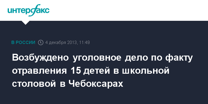 Чебоксары. 4 декабря. INTERFAX.RU - Следственные органы МВД Чувашии по факту отравления учеников школы № 30 в Чебоксарах в конце ноября возбудили уголовное дело по ч. 1 ст. 236 УК РФ (нарушение санитарно-эпидемиологических правил).