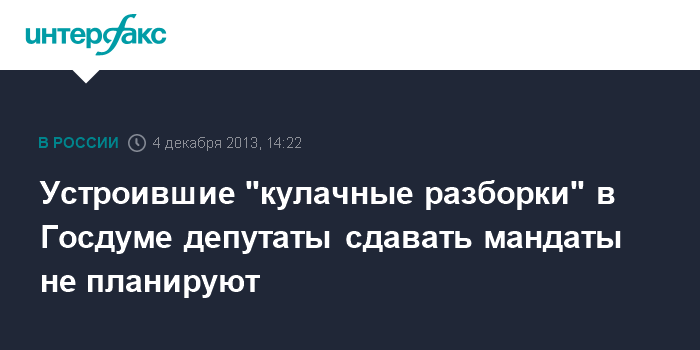 Москва. 4 декабря. INTERFAX.RU - Ни один из участников потасовки, произошедшей в Госдуме вечером во вторник, не собирается сдавать депутатский мандат.