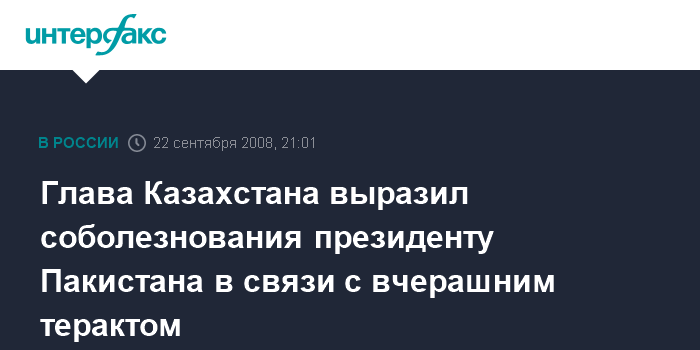 Москва. 22 сентября. INTERFAX.RU - Президент Казахстана Нурсултан Назарбаев направил телеграмму соболезнования президенту Пакистана Асифу Али Зардари в связи с произошедшим в этой стране террористическим актом, сообщила пресс-служба главы Казахстана.