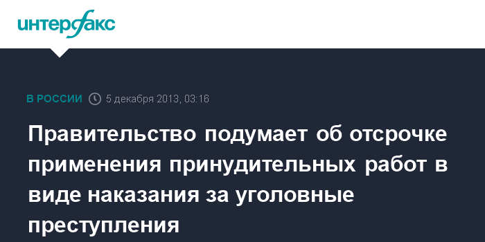 Москва. 5 декабря. INTERFAX.RU - Правительство РФ на заседании в четверг обсудит вопрос об отсрочке до начала 2017 года применения принудительных работ в качестве уголовного наказания.