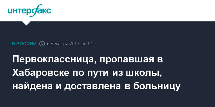 Хабаровск. 5 декабря. ИНТЕРФАКС - ДАЛЬНИЙ ВОСТОК - В Хабаровске семилетняя девочка, которая в среду не вернулась из школы домой, обнаружена в одном из оврагов Южного округа Хабаровска, ребенок доставлен в больницу, сообщает СУ СКР по Хабаровскому краю в четверг.