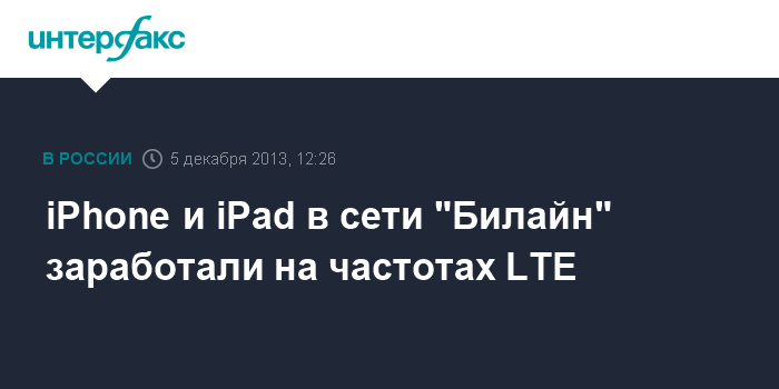 Москва. 5 декабря. INTERFAX.RU - Apple включила доступ к LTE в смартфонах iPhone 5s, iPhone 5с и в планшетах iPad Air и iPad Mini, работающих в сети ОАО "Вымпелком" (бренд "Билайн"). LTE будет работать на устройствах, сертифицированных и приобретенных в российских розничных сетях, сообщил "Вымпелком".