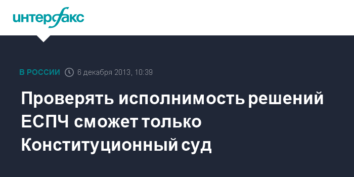Санкт-Петербург. 6 декабря. INTERFAX.RU - Конституционный суд РФ в пятницу постановил, что только он может разрешить вопрос о применимости законодательных норм, которые препятствуют исполнению постановления Европейского суда по правам человека, но не были ранее признаны неконституционными.