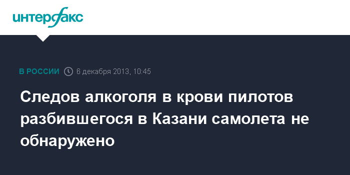 Москва. 6 декабря. INTERFAX.RU - В крови членов экипажа Boeing авиакомпании "Татарстан", разбившегося в Казани, следов алкоголя или наркотических веществ не обнаружено.