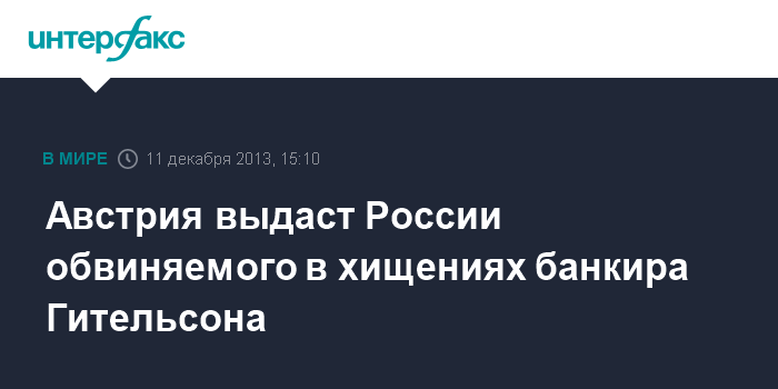 Москва. 11 декабря. INTERFAX.RU - Австрийские власти приняли решение экстрадировать гражданина РФ, бывшего главу банка ВЕФК и ОАО "Инкасбанк" Александра Гительсона, объявленного в международный розыск по обвинению в хищении в особо крупном размере.