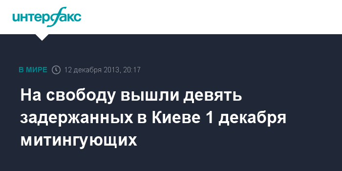 Киев. 12 декабря. INTERFAX.RU - В Киеве освобождены 7 из 9 задержанных участников событий 1 декабря у здания администрации президента Украины, а также двое из трех привлеченных к ответственности за беспорядки возле здания кабмина.