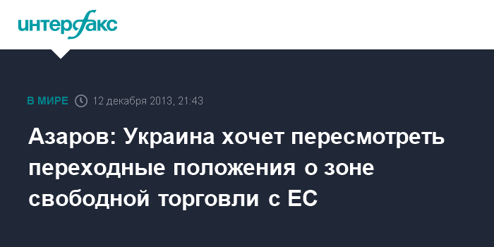 Киев. 12 декабря. INTERFAX.RU - Украина предлагает отодвинуть сроки вступления отдельных норм соглашения о зоне свободной торговли (ЗСТ) с Евросоюзом, в частности, в агросекторе, пересмотрев переходные положения, заявил премьер-министр Николай Азаров.