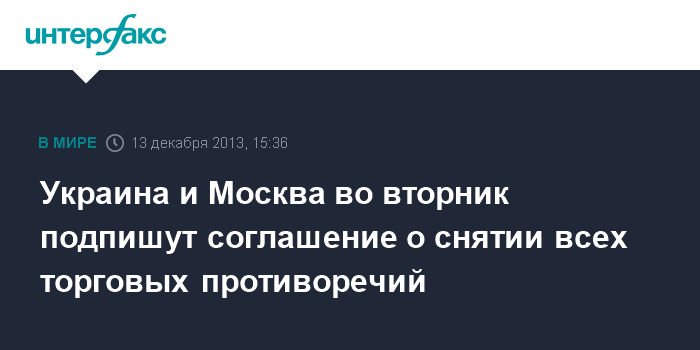 Киев. 13 декабря. INTERFAX.RU - Украина во вторник подпишет в Москве соглашения о снятии большинства торговых противоречий с Россией. "На вторник (17 декабря. - ИФ) намечается поездка в Москву, чтобы на уровне президентов мы могли оформить соглашения, снимающие подавляющее большинство противоречий в торговле с Российской Федерацией", - сказал премьер-министр Николай Азаров на встрече с представителями промышленности Украины в пятницу.