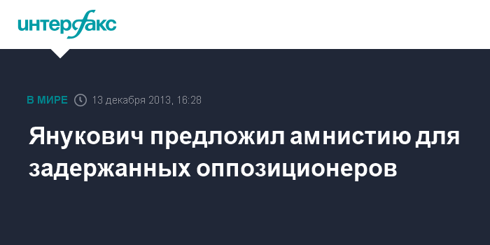 Киев. 13 декабря. INTERFAX.RU - Президент Украины Виктор Янукович предлагает объявить амнистию в отношении людей, которые были задержаны во время массовых акций в Киеве.
